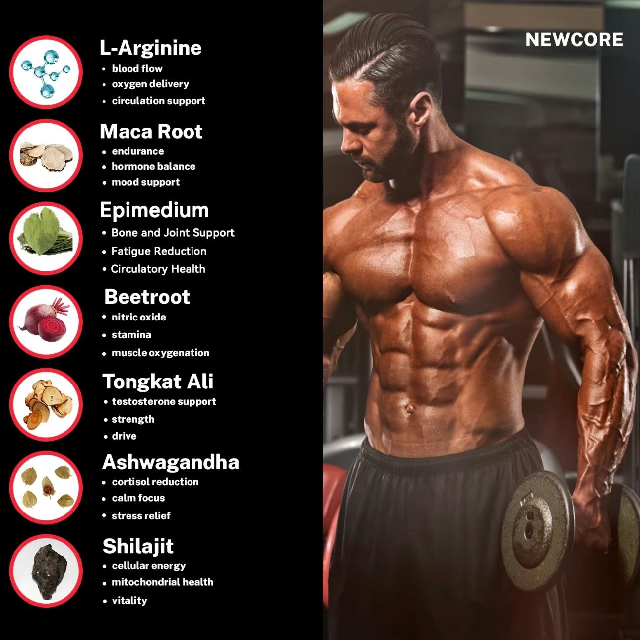Botanical Support Blend Includes plant-based adaptogens like Tongkat Ali, Maca Root, and Ashwagandha, traditionally used to support vitality and overall well-being.
