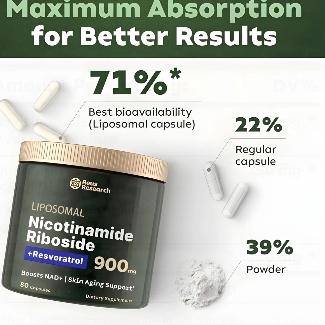 🌿Enhanced Absorption Technology: Our liposomal NR encapsulationsupports improved bioavailability for better nutrient utilizationcompared to standard supplements.