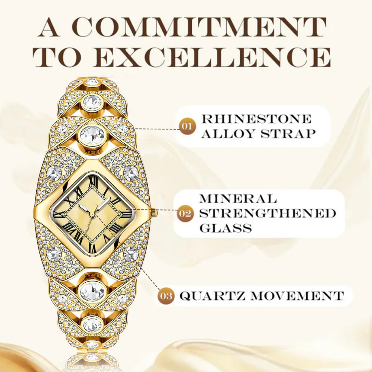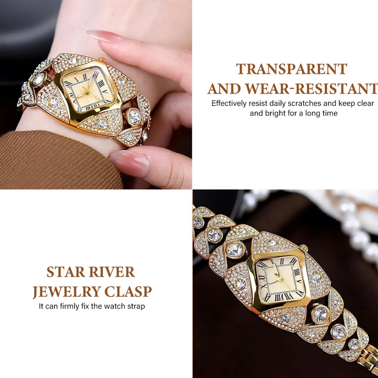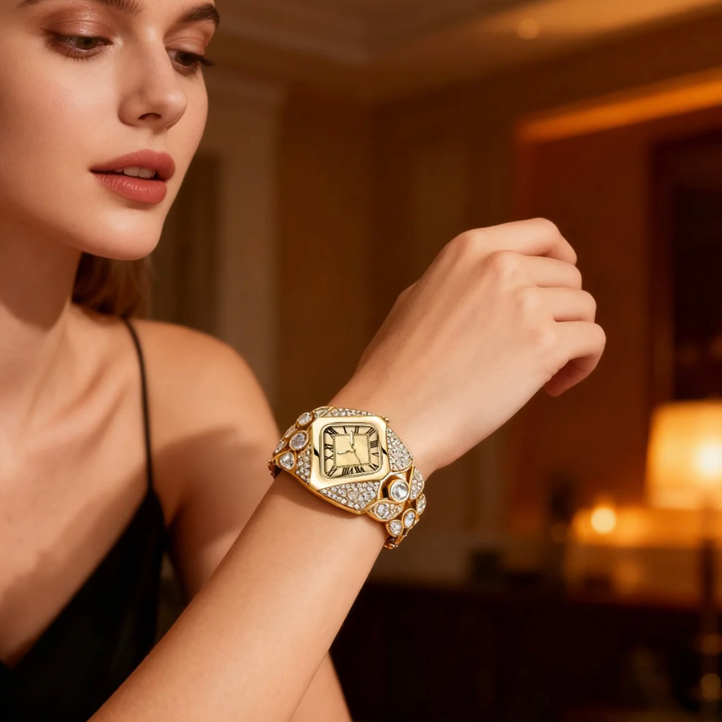 This bangle watch is a luxury piece. It features a premium stainless steel quartz movement. The watch is 30M water-resistant, making it suitable for everyday wear. It's a stylish bling jewelry piece that adds a touch of elegance to any outfit. Perfect as a gift.