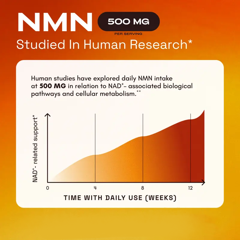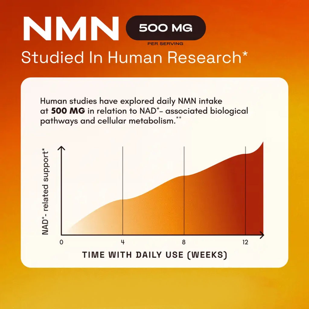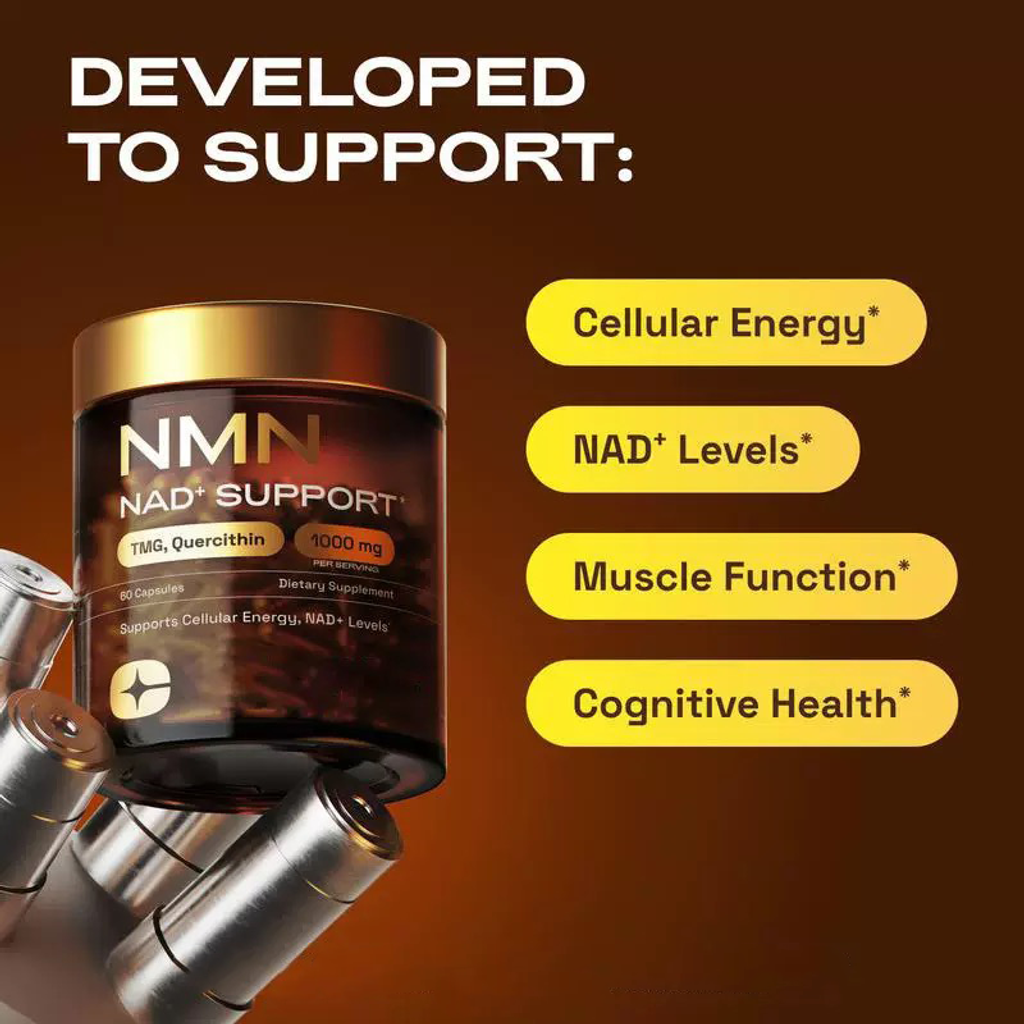 NAD⁺ Supplement is a complex blend designed to support NAD⁺ levels. It combines NMN, Quercetin, TMG, and Resveratrol.