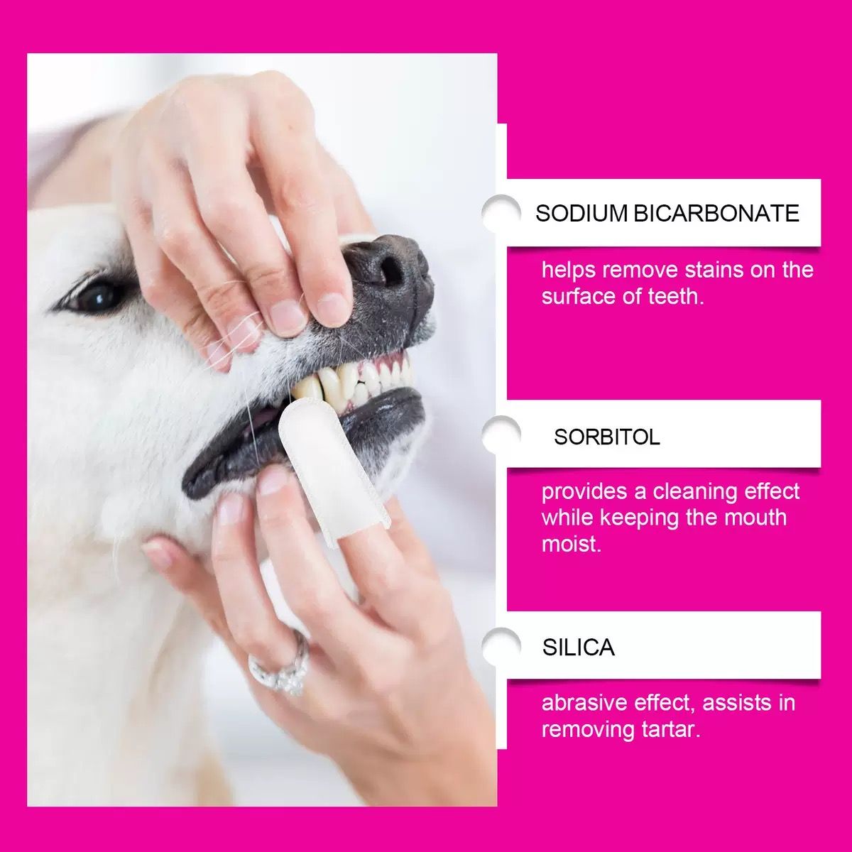 Dental Finger Wipes: Our Pet Dental Finger Wipes are formulated to tackle bad breath and promote cleaner teeth for dogs and cats. Made with soft, non-woven polyester blended fabric infused with natural ingredients, they effectively remove plaque, freshen breath, and support healthy gums. Aloe Free Paraben Free Alcohol Free Non-Toxic.